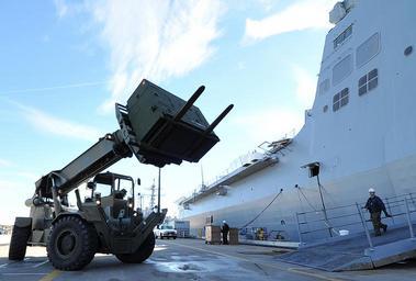 | Keywords: USS San Antonio prepares for Hurricane Sandy relief 121031-N-KQ416-019.jpg en Boatswain's Mate 3rd Class Michael Welsh operates a 20K rough terrain forklift to load a pallet onto the amphibious transport dock ship USS San Antonio LPD 17 San Antonio is getting underway to better position Navy assets if required to provide Navy relief to areas affected by Hurricane Sandy U S Navy photo by Mass Communication Specialist 3rd Class Zachary S Welch 2012-10-31 Seaman Zachary S Welch https //www dvidshub net/image/772399 121031-N-KQ416-019 2012-11-02 05 32 NORFOLK VA US PD-USGov-Military-Navy USS San Antonio LPD-17 Images from DoD uploaded by Fæ |
