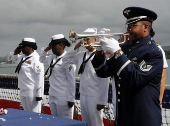 | Keywords: USS Sigsbee Remembrance Ceremony 110414-N-VM928-082.jpg en A U S Air Force bugler plays Taps during a remembrance ceremony for the Fletcher-class USS Sigsbee aboard the guided-missile destoryer USS Chung-Hoon The ceremony was held to pay respects to the 23 Sailors whose lives were lost when a kamikaze suicide plane struck Sigsbee on April 14 1945 during the Battle of Okinawa Chung-Hoon is named in honor of Rear Adm Gordon Paie'a Chung-Hoon who was awarded the Navy Cross and Silver Star for gallantry as the commanding officer of Sigsbee during the Battle of Okinawa 2011-04-14 Robert Stirrup https //www dvidshub net/image/390452 110414-N-VM928-082 2011-04-16 01 52 PEARL HARBOR HI US x100px PD-USGov-Military-Navy DEFAULTSORT US Navy 110414-N-VM928-101 A U S Air Force bugler plays Taps during a remembrance ceremony for USS Sigsbee DD 502 aboard SS Chung-Hoon DDG 93 jpg Images from DoD uploaded by Fæ USS Chung-Hoon DDG-93 at Pearl Harbor Taps bugle call USS Sigsbee DD-502 |