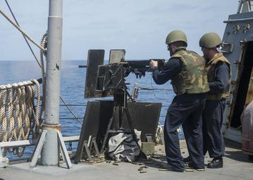 | Keywords: USS STOUT (DDG 55) TRAINING 160629-N-GP524-144.jpg en 160629-N-GP524-144 GULF OF OMAN June 29 2016 Gunner ™s Mate Seaman Ryan Stringer left fires a 50 caliber machine gun aboard USS Stout DDG 55 while Gunner ™s Mate 1st Class Robert Deck stands by as safety Stout an Arleigh Burke class guided-missile destroyer deployed as part of the Eisenhower Carrier Strike Group is supporting Operation Inherent Resolve maritime security operations and theater security operations in the U S 5th Fleet area of operations U S Navy photo by Mass Communication Specialist 3rd Class Bill Dodge/Released Unit Navy Media Content Services DVIDS Tags SAR; Search and Rescue; formation; ocean; transit; Bahrain; RAS; GQ; general quarters; Arleigh Burke-class; America; underway; CIWS; 6th Fleet; guided-missile destroyer; RIA; Manama ; forward deployed; Memorial Day; USS Stout DDG 55 ; ship; SUEZ CANAL; Navy; COMREL; Sailor; community relations; destroyer; replenishment-at-sea; U S Navy; 5th Fleet; deployment; MC; Stout; USS Stout; DDG 55; Lt Michael Murphy; NMCS; DVIDS Bulk Import; Mass Communication Specialist 3rd Class Bill Dodge; MC3 Bill Dodge; Murph Challenge; ARGONAUT 2016; Sailors giving back; Regional Institute of Active Learning 2016-06-29 Petty Officer 3rd Class William Dodge https //www dvidshub net/image/2706017/uss-stout-ddg-55-training 160629-N-GP524-144 2016-07-06 00 04 GULF OF OMAN PD-USGov-Military-Navy Manama USS Stout DDG-55 Images from DoD uploaded by Fæ |