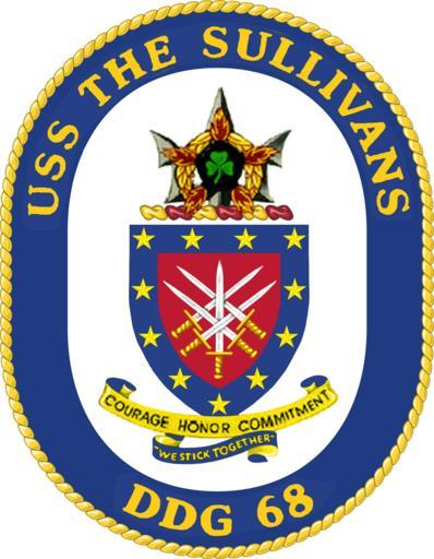 Keywords: USS The Sullivans crest.png en Shield The dark blue and gold represent the sea and excellence They are also the Navy's tradition colors Red is emblematic of courage and sacrifice The five interlaced swords honor the five Sullivan brothers killed in action during WW II and commemorate their spirit of teamwork and patriotism The upright points of the swords allude to the present ship's combat readiness and its missile system The boarder reflects unity and the eleven stars represent the battle stars earned by the first USS THE SULLIVANS; nine for WW II and two for the Korean War Crest The trident symbol of sea prowess symbolizes DDG 68's modern warfare capabilities; the AEGIS and vertical launch system The fireball underscores the fierce battle of Guadalcanal where the five brothers courageously fought and died together and highlights its firepower of the past and present USS THE SULLIVANS The inverted wreath a traditional symbol of the ultimate sacrifice is in memory of the Sullivan brothers The shamrock recalls the Irish heritage The arms are blazoned in full color upon a white oval enclosed by a dark blue collar edged on the outside with a gold rope and bearing the name USS THE SULLIVANS at the top and DDG 68 in the base in gold http //www sullivans navy mil/site 20images/crest gif from http //www sullivans navy mil/site 20pages/crest aspx Converted to PNG US Navy USS The Sullivans DDG-68 United States Navy destroyer emblems PD-USGov-Military-Navy |