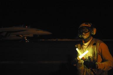 | Keywords: USS Theodore Roosevelt operations 151002-N-ZF498-126.jpg en 151002-N-ZF498-126 ARABIAN GULF Aviation Boatswain's Mate 3rd Class Brett Siebel checks to verify the flight line is clear before giving the signal to launch a F/A-18F Super Hornet assigned to the Red Rippers of Strike Fighter Squadron 11 during night-time flight operations aboard the aircraft carrier USS Theodore Roosevelt Theodore Roosevelt is deployed in the U S 5th Fleet area of operations supporting Operation Inherent Resolve strike operations in Iraq and Syria as directed maritime security operations and theater security cooperation efforts in the region <br>Unit Navy Media Content Services 2015-10-02 Oct 2 2015 https //www dvidshub net/image/2226208/uss-theodore-roosevelt-operations 151002-N-ZF498-126 2015-10-11 03 08 USS THEODORE ROOSEVELT ARABIAN SEA PD-USGov-Military-Navy F/A-18F Super Hornet USS Theodore Roosevelt CVN-71 Images from DoD uploaded by FĂŚ |