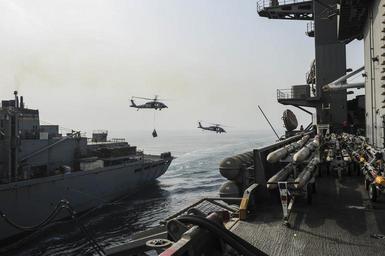 | Keywords: USS Theodore Roosevelt operations 150715-N-FI568-124.jpg en 150715-N-FI568-124 ARABIAN GULF July 15 2015 A pair of MH-60S Sea Hawk Helicopters assigned to the Sea Knights of Helicopter Sea Combat Squadron HSC 22 transport cargo from the Military Sealift Command fast combat support ship USNS Arctic T-AOE 8 during an underway replenishment aboard the aircraft carrier USS Theodore Roosevelt CVN 71 Theodore Roosevelt is deployed in the U S 5th Fleet area of operations supporting Operation Inherent Resolve strike operations in Iraq and Syria as directed maritime security operations and theater security cooperation efforts in the region U S Navy photo by Mass Communication Specialist 3rd Class Taylor L Jackson/Released <br>Unit Navy Media Content Services 2015-07-15 Petty Officer 3rd Class Taylor Jackson https //www dvidshub net/image/2077031/uss-theodore-roosevelt-operations 150715-N-FI568-124 2015-07-22 23 34 USS THEODORE ROOSEVELT MEDITERRANEAN SEA PD-USGov-Military-Navy MH-60S Seahawk USS Theodore Roosevelt CVN-71 Images from DoD uploaded by Fæ |