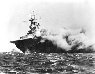 Keywords: USS Wasp (CV-7) sinking in September 1942.jpg The U S Navy aircraft carrier USS Wasp CV-7 listing and with smoke pouring from oil and gasoline fires caused by three torpedo hits in the starboard side from the Japanese submarine I-19 Her list has been corrected to 4 degrees by transferring oil and her head has been brought round so that the wind blows from the starboard side and drives the smoke off the ship and away from the control areas on the island All damage control efforts however were in vain and she was sunk 400 km north west of Espiritu Santo 302770 1942-09-15 Official U S Navy photo http //www history navy mil/photos/images/g10000/g16331c htm 80-G-16331 from the U S Navy http //www history navy mil Naval History and Heritage Command File USS Wasp CV-7 brennt jpg PD-USGov-Military-Navy USS Wasp CV-7 Burning ships Sinking ships Guadalcanal Campaign 15 September