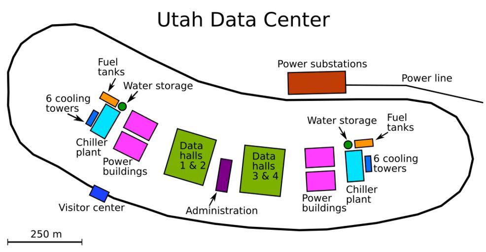 Keywords: Utah Data Center of the NSA in Bluffdale Utah vector.svg Data Center In Utah built by National Security Agency of the United States Two pairs of Data Halls administrative buildings between them Each pair of data hall has two own power generation plants one chiller plant and 6 cooling towers Perimeter road is shown in black Data Center has own power substation With more then 1 million square feet it is http //www forbes com/pictures/fhgl45ijg/utah-data-center/ 3rd largest datacenter in the world Plans were published by Forbes com http //www forbes com/sites/kashmirhill/2013/07/24/blueprints-of-nsa-data-center-in-utah-suggest-its-storage-capacity-is-less-impressive-than-thought/ Blueprints Of NSA's Ridiculously Expensive Data Center In Utah Suggest It Holds Less Info Than Thought - 7/24/2013 Positions are drawn from OpenStreetMap map File OSM map of Utah Data Center of the NSA in Bluffdale Utah png CC-BY-SA 2 0 2013-12-29 07 19 17 own A5b thumb 40 42742 -111 93179 cc-zero Uploaded with UploadWizard Utah Data Center
