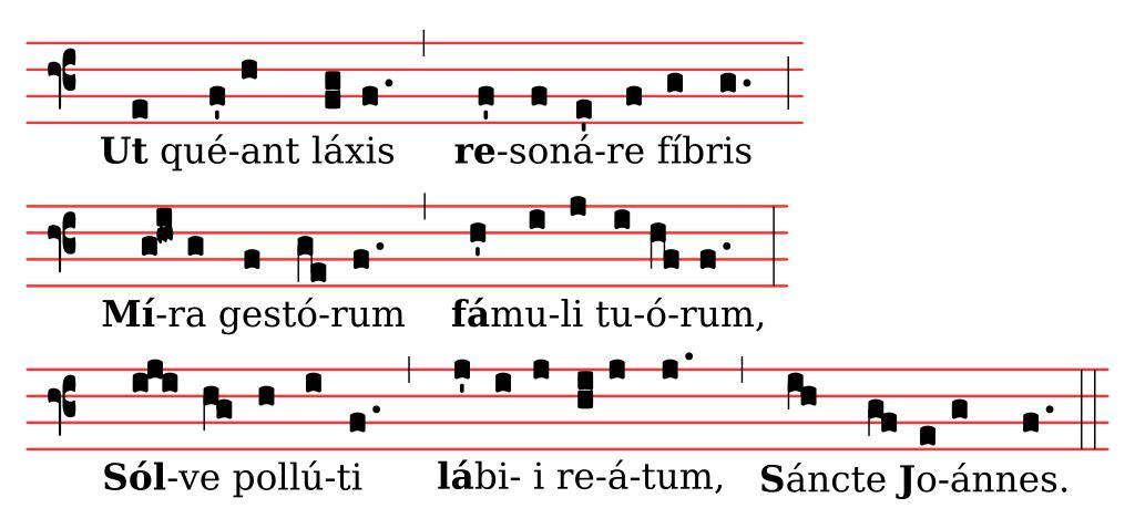 Keywords: UtQueantLaxis-Arezzo.svg en Hymn to John the Baptist used by Guido of Arezzo to name the six notes of the hexacord fr Hymne à Saint Jean Baptiste utilisé par Guido d'Arezzo pour nommer les six notes de l'hexacorde Own Romainbehar 2008-07-19 Image Hymne St Jean Baptiste png File generated from the SVG output of Lilypond with the following file <pre> \version 2 10 33 \include gregorian-init ly \score \new VaticanaVoice \clef vaticana-fa2 c d\ictus f \ d \pes e \ \augmentum d \divisioMinima d\ictus d c\ictus d e \flexa \augmentum e \divisioMaior \score \new VaticanaVoice \clef vaticana-fa2 \ e \quilisma f \pes g \ e d \ e \flexa c \ \augmentum d \divisioMinima f\ictus g a g \ f \flexa d \ \augmentum d \divisioMaxima \score \new VaticanaVoice \clef vaticana-fa2 \ g a g \ \ f \flexa e \ f g \augmentum d \divisioMinima a\ictus g a \ f \pes g \ a \augmentum a \divisioMinima \ g \flexa f \ \ e \flexa d \ c e \augmentum d \finalis </pre> Reworked the sheet music and added lyrics with Inkscape Guido of Arezzo Ut quenat Sheet music examples Ut quenat Music theory Ut quenat Images with LilyPond source code |