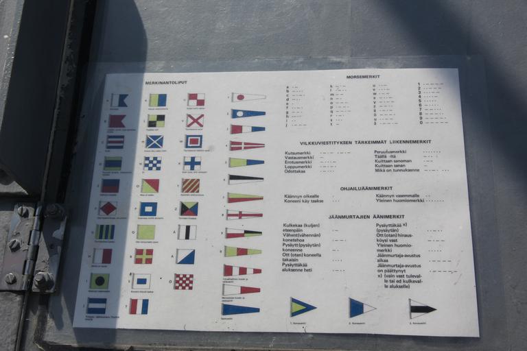 | Keywords: Uusimaa Turku 2011 signal flag table.JPG en Finnish minelayer Uusimaa instruction table showing signal flags morse code important signal lamp and sound codes Photographed during Finnish Navy 2011 anniversary in Turku fi Miinalaiva Uusimaan opastaulu jossa on kuvattu merkinantoliput morsemerkit tärkeimmät vilkkumerkit sekä äänimerkit Kuvattu Turussa merivoimien vuosipäivänä 2011 own MKFI 2011-07-09 Uusimaa 05 Finnish Navy anniversary 2011 International Code of Signals Taken with Canon EOS 60D Taken with Canon EF-S 15-85mm F3 5-5 6 IS USM Files by User MKFI |