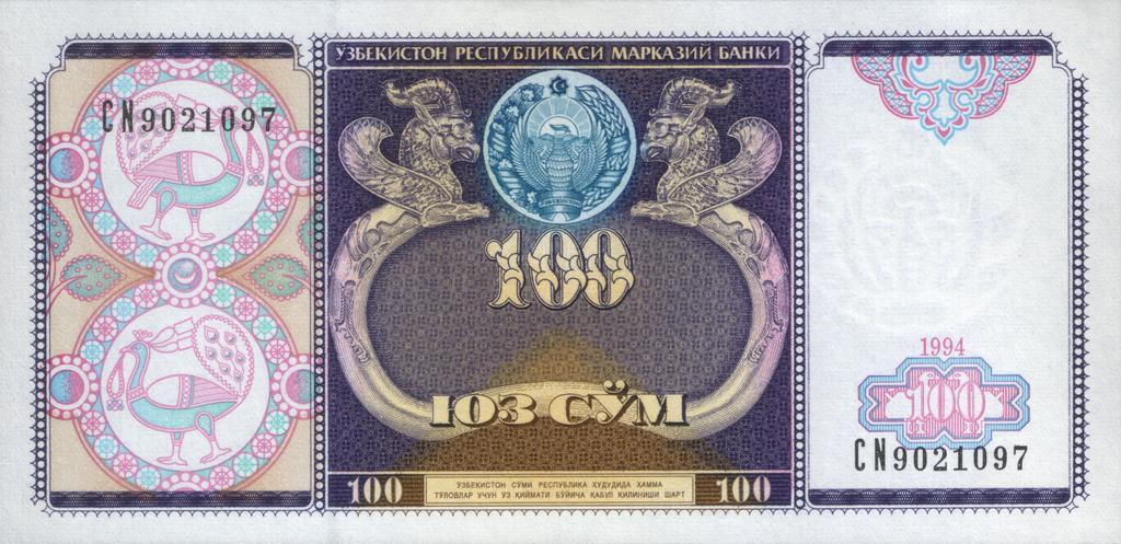 Keywords: UZS100 1994 front.jpg 100 сум Узбекистана 1994 100 sum of Uzbekistan 1994 own scan 1994 Central Bank of the Republic of Uzbekistan Цент альный банк Республики Узбекистан Ўзбекистон Республикаси а казий банки PD-UZ-exempt banknotes Banknotes of Uzbekistan Banknotes with a face value of 100 1994 banknotes Peacocks on banknotes Coats of arms of Uzbekistan on banknotes |