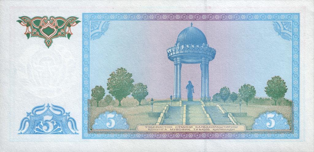 Keywords: UZS5 1994 back.jpg 5 cум узбекистана 1994 5 soms of Uzbekistan 1994 own scan 1994 Цент альный банк Республики Узбекистан The Central bank of the Republic of Uzbekistan Ўзбекистон Республикаси ма казий банки PD-UZ-exempt banknotes Banknotes of Uzbekistan Ali-Shir Nava'i Monument in Tashkent Banknotes with a face value of 5 Blue banknotes Buildings on banknotes 1994 banknotes |