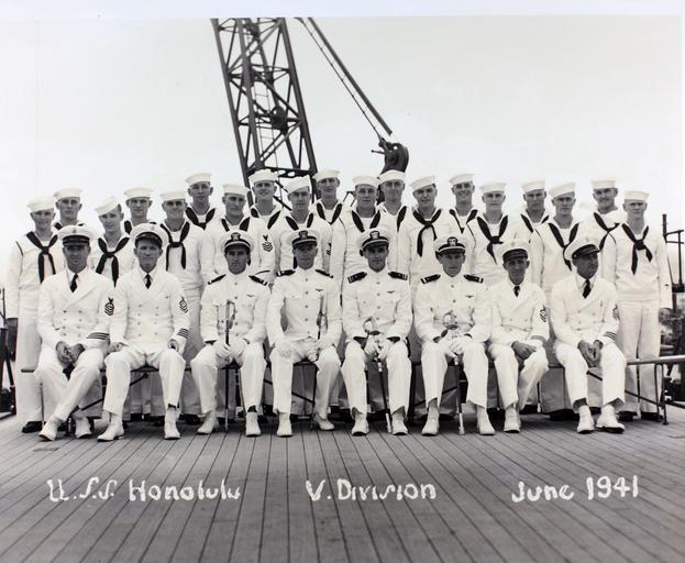 Keywords: ship warship united states navy unitedstatesnavy us navy usnavy usn uss honolulu (cl-48) usshonolulucl48 uss honolulu usshonolulu light cruiser lightcruiser cruiser cl-48 cl48 brooklyn-class brooklynclass text outdoor SDASM.CATALOG: Karaberis_0001 SDASM.TITLE: V. Division onboard U.S.S. Honolulu SDASM.CORPORATION NAME: SDASM.DATE: Jun-41 SDASM.LOCATION: SDASM.ADDITIONAL INFORMATION: seated - 3rd from left Barnett SDASM.CATALOG: Karaberis_0001 SDASM.TITLE: V. Division onboard U.S.S. Honolulu SDASM.CORPORATION NAME: SDASM.DATE: Jun-41 SDASM.LOCATION: SDASM.ADDITIONAL INFORMATION: seated - 3rd from left Barnett
