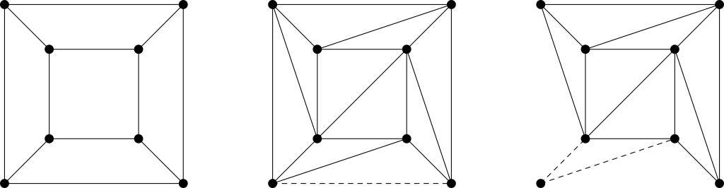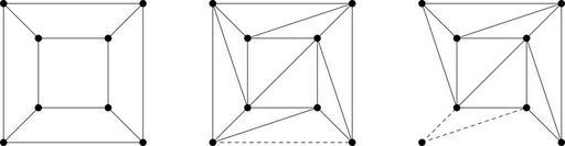 | Keywords: V-E+F=2 Proof Illustration.svg M - beginfig 1 pair A B C; A0 1cm 1cm ; A1 5cm 1cm ; A2 5cm 5cm ; A3 1cm 5cm ; A4 2cm 2cm ; A5 4cm 2cm ; A6 4cm 4cm ; A7 2cm 4cm ; for i 0 upto 7 draw Ai withpen pencircle scaled 6pt; Bi Ai + 6cm 0cm ; draw Bi withpen pencircle scaled 6pt; Ci Ai + 12cm 0cm ; draw Ci withpen pencircle scaled 6pt; endfor; draw A0--A1--A2--A3--cycle; draw A4--A5--A6--A7--cycle; draw A0--A4; draw A1--A5; draw A2--A6; draw A3--A7; draw B0--B1 dashed evenly; draw B1--B2--B3--B0; draw B4--B5--B6--B7--cycle; draw B0--B4; draw B1--B5; draw B2--B6; draw B3--B7; draw B4--B6; draw B0--B5; draw B1--B6; draw B2--B7; draw B3--B4; draw C1--C2--C3; draw C4--C5--C6--C7--cycle; draw C0--C4 dashed evenly; draw C1--C5; draw C2--C6; draw C3--C7; draw C4--C6; draw C0--C5 dashed evenly; draw C1--C6; draw C2--C7; draw C3--C4; endfig; end; Polyhedra |