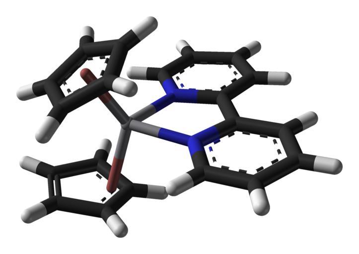 | Keywords: V(eta-3-Cp)(eta-5-Cp)(bipy)-from-xtal-2007-3D-sticks.png Stick model of the 2 2 ²-bipyridine η<sup>3</sup>-cyclopentadienyl η<sup>5</sup>-cyclopentadienyl vanadium II complex Cp<sub>2</sub>V bipy from the crystal structure Crystal structure by X-ray diffraction from http //dx doi org/10 1002/ejic 200700904 Eur J Inorg Chem 2007 5168-5172 Model constructed in http //www crystalmaker com/ CrystalMaker 8 1 Image generated in http //accelrys com/products/discovery-studio/visualization/discovery-studio-visualizer html Accelrys DS Visualizer own 2009-06-18 Ben Mills Benjah-bmm27 Images by Ben Mills 2 2 ²-Bipyridine η3-cyclopentadienyl η5-cyclopentadienyl vanadium II |