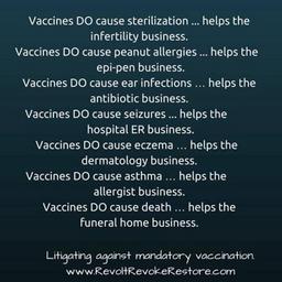 | Keywords: anti vaccine vaccination vax disease health poison population control needle syringe text outdoor Vaccines do cause sterilization, helps the infertility business. Vaccines do cause peanut allergies, helps with the epi-pen business. Vaccines do cause ear infections, helps with the antibiotic business. Vaccines do cause seizures, helps hospital ER business. Vaccines do cause eczema, helps the dermatology business. Vaccines do cause asthma, helps the allergist business. Vaccines do cause death, helps the funeral home business. Anti Vaccination meme collected by A.J. Wilson of iPressThis at FlatEarth.Online, made by others. Vaccines do cause sterilization, helps the infertility business. Vaccines do cause peanut allergies, helps with the epi-pen business. Vaccines do cause ear infections, helps with the antibiotic business. Vaccines do cause seizures, helps hospital ER business. Vaccines do cause eczema, helps the dermatology business. Vaccines do cause asthma, helps the allergist business. Vaccines do cause death, helps the funeral home business. Anti Vaccination meme collected by A.J. Wilson of iPressThis at FlatEarth.Online, made by others. |