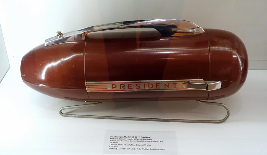 | Keywords: Vacuum cleaner, Model VC 6017, President, Landers, Frary & Clark, New Britain, CT, c. 1940, bakelite, chrome-plated iron - Museum für Angewandte Kunst Köln - Cologne, Germany - DSC09527.jpg Industrial design right Hence this work is now in the public domain 2015-11-28 10 42 38 own Daderot other versions cc-zero Collections of the Museum für Angewandte Kunst Köln Landers Frary and Clark Vacuum cleaners | ||||