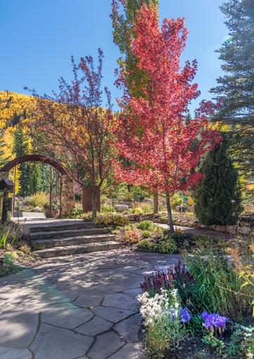 Keywords: vail colorado betty ford park path foliage trees flowers sky nature green landscape scene tree color exterior outdoors colorful