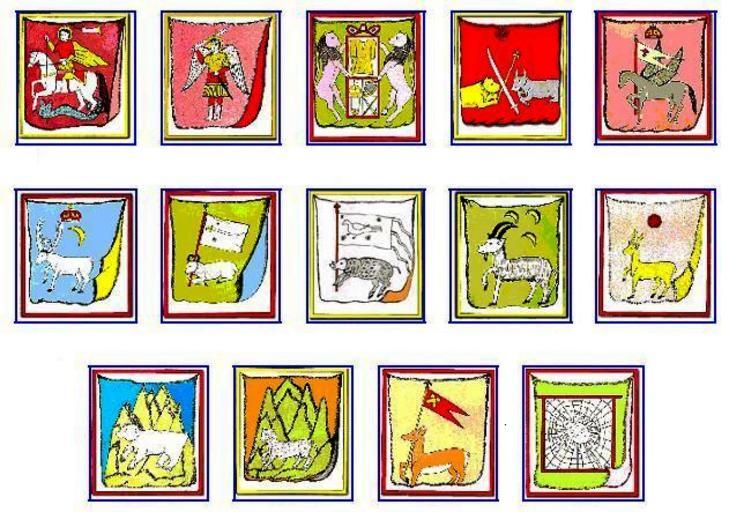 | Keywords: Vakhushti Georgian flags collage.PNG en A collage of the Georgian and Caucasian flags found in the atlas authored by the 18th-century Georgian scholar Prince Vakhushti From left to right top to bottom 1 of Georgia 2 of Georgia 3 Royal-Davidic with Tunic 4 of Kartli 5 of Kakheti 6 of Imereti 7 of Samtskhe-Saatabago 8 of Odishi 9 of Abkhazia 10 of Guria 11 of Svaneti 12 of Ossetia 13 of Shirvan 14 of Arran 2012-08-01 own Kober cc-zero Uploaded with UploadWizard Historical flags of Georgia Vakhushti |