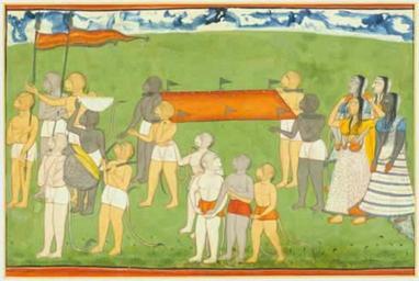 | Keywords: Vali last rites.jpg en The funeral procession for Bali the 'vanara' king The palanquin bearing King Bali ™s corpse to its cremation is carried by four 'vanaras' depicted as monkeys in a procession led by two standard-bearers and a monkey who sprinkles sacred water from a bowl carried on the head of another In the foreground four more monkeys walk beside the bier preceded by a drummer and a drum-bearer The cortege ends with the grief-stricken Queen Tara and three mourners represented as human woman The puffy clouds and plain landscape typical of Nurpur pictures are evident The picture has a red border with black white and blue-grey rules 1700-1729 http //artworld uea ac uk/artworld_catalogue/funeral-procession-bali-vanara-king author PD-old-100 Nurpur India Uploaded with UploadWizard Death of Vali Mourning People with funeral biers Funeral processions in art Tara Ramayana Carrying biers |