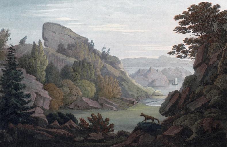 Keywords: Valley in Heliesund (JW Edy plate 08).jpg Artwork Creator John William Edy en Valley in Heliesund No VIII VIEW FROM A VALLEY ON THE SOUTH SIDE OF HELIESUND This small undulating spot is enclosed with rocks on three of its sides; having gentle rills of water meandering through it where the snipe and woodcock breed A disruption of the rocks has nearly closed the entrance Similar casualties in some parts of Norway have buried in an instant houses and families The dilation of the strata by frosts loosens the stones; which in their fall carry every thing with them and form a vast heap of rubbish at the bottom At the extremity of the valley is a landing-place constructed of timber and at a little distance are rocky islands beyond which the main land is seen In front is a majestic rock of granite seated on an inclined plane apparently ready to glide into the ocean This spot being well sheltered from the bleak winds is the chosen retreat of a colony of wild bees; their nests are suspended from the branch of the pine or hawthorn in the form of a pine apple and of a lead colour The bees are small and their honey uncommonly good They collect their sweets from a few flowers the wild thyme and other odoriferous herbs and plants from the river's bank to the mountain's top with great care and industry Collapse bottom http //urn nb no/URN NBN no-nb_digibok_2011072910001 Boydell's picturesque scenery of Norway London 1820 Plate no 8 p 89 in scanned copy no-nb_digibok_2011072910001 PD-Art-100 John William Edy Boydell's picturesque scenery of Norway Søgne |