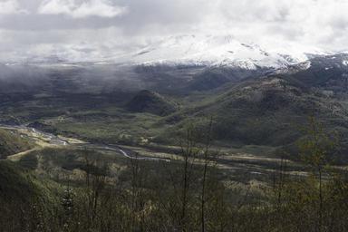 Keywords: valley view above high mountains snow peak summit top panorama river vegetation landscape nature outdoor hiking forest trees freedom cloudy overcast