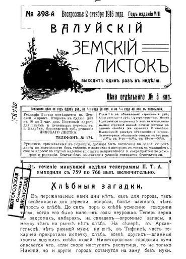 | Keywords: Valuyskyi-zemskyi-listok-398-titul.jpg ru «Валуйский земский листок» - пе вая в Во онежской губе нии земская газета Это егуля ное еженедельное издание бе ет начало с 1908 года Издателем выступило Валуйское земство Газета состояла как п авило из 24 cт аниц 2014-11-28 Валуйский земский листок 398 Воск есенье 2 октяб я / Валуйское земство; ед К Д Блинов - Год издания VIII - Валуйки Типог афия Баевского 1916 - 24 с Белго одская ГУ Б author other versions PD-old-70-1923 Uploaded with UploadWizard Valuyskiy Zemskiy Listok |