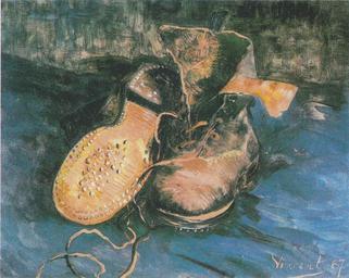 | Keywords: Van Gogh - Ein Paar Schuhe1.jpeg Artwork Creator Vincent van Gogh Paris early 1887 oil canvas cm 34 41 5 Institution Baltimore Museum of Art accession number 1950 302 http //www artbma org/educators/atg/pdf/atg_12-07 pdf The Baltimore Museum of Art<br/>http //www vangoghgallery com/catalog/Painting/379/Pair 20of 20Shoes 20A html vangoghgallery com object history credit line The Cone Collection formed by Dr Claribel Cone and Miss Etta Cone of Baltimore Maryland exhibition history Vincent 87 ~ lower right signature and date Van Gogh catalogues 333 1236 repro from art book PD-old-100 DEFAULTSORT Van Gogh 1887 A pair of shoes Baltimore Museum of Art A pair of shoes by Vincent van Gogh Paris 1887 |
