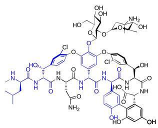 | Keywords: Vancomycin 01.svg The chemical structure of Vancomyine In blue all D-amino acids Die Strukturformel von Vancomycin In Blau hervorgerufen sind die D-Aminosäuren own and from http //archiv ub uni-marburg de/diss/z2006/0516/ 2012-09-21 Kuebi Armin Kübelbeck Vancomycin |