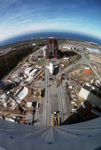 Keywords: vandenberg afb california space shuttle enterprise buildings outside sky clouds moving fisheye 1985