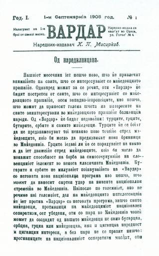 Keywords: Vardar1.jpg en The cover page of the Macedonian magazine Vardar published by Krste Petkov Misirkov in Odesa on 1 September 1905 mk Ко ица на македонското списание Ва да издадено од ст ана на К сте Петков иси ков во Одеса на 1 септемв и 1905 Originaly uploaded on mk wikipedia org K P Misirkov 1905-01-01 Magazine Vardar PD-old |