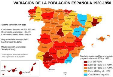 | Keywords: Variación de la población española entre 1920 y 1950.svg Mapa de España con las variaciones de población por provincias en el periodo 1920-1950 según los censos correspondientes del Instituto Nacional de Estadística Instituto Nacional de Estadística de España http //www ine es/inebase/cgi/um M 2Ft20 2Fe245 2Fp05 O inebase N L 0 2007-08 Creado por Rodriguillo tomando como mapa base Image Provinces of Spain svg creado por Emilio Gómez Fernández GFDL Image Variación de la población española entre 1920 y 1950 png Rodriguillo Population maps of Spain 1920 1950 |