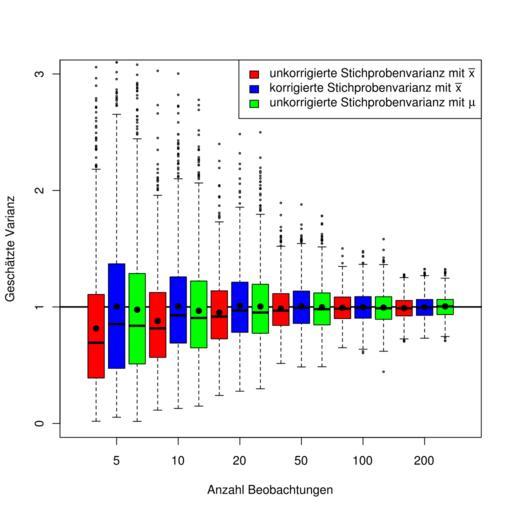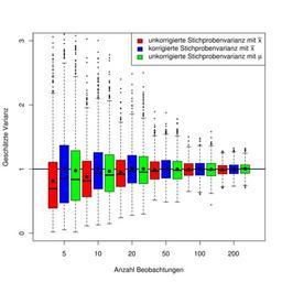 Keywords: Varianzschaetzung.svg en Variance estimation with different estimators for standard normal distributed data and different sample sizes 2011-05-31 own Sigbert cc-zero Uploaded with UploadWizard Box plots