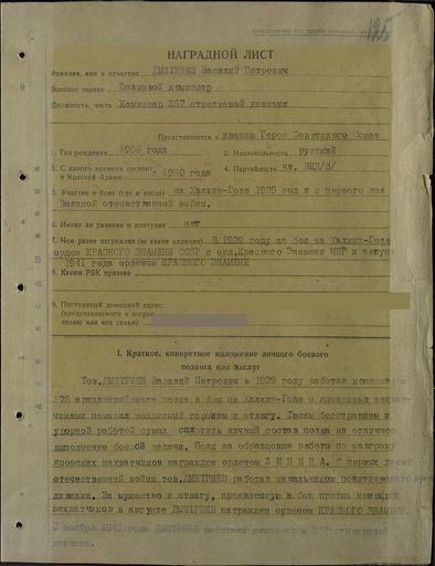 | Keywords: Vasily Dmitriev award nomination.jpg ru П едставление полкового комисса а РККА В П Дмит иева к званию Ге оя Советского Союза Лист 1 1942 http //www podvignaroda ru/ n 28078766 По тал «Подвиг на ода» наг адной лист на звание Ге оя Советского Союза Политотдел 59-й а мии Волховского ф онта other versions Custom license marker 2015 07 19 PD-RU-exempt PD-ineligible Uploaded with UploadWizard Vasily Dmitriev | ||||