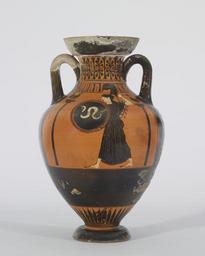 | Keywords: Vatican G 23 Group - Black-figure Pseudo-Panathenaic Amphora - Walters 482105 - Side A.jpg On side A Athena is striding to the left with a spear in her raised left hand and a shield in her right with a large snake a popular shield device on Panathenaic vases of the late Archaic period She is wearing a patterned garment a high-crested helmet and the aegis from which several snake heads clearly emerge Two thin columns crowned by roosters frame the scene The reverse shows two young jockeys in high gallop in the heat of the race Both boys are nude and ride without saddles or stirrups guiding the horse with their reins The rider in the back is using a whip in his raised right hand to gain some ground on his opponent The focus is clearly on the rider on the left whose horse occupies the composition's foreground its head partially obscuring the other rider The prominence of the horse and rider captured at a decisive moment in the race may signal the contest's victor The amphora lacks the prize inscription on the front that is characteristic of small-scale copies created for trade and as commemorative souvenirs of the Panathenaic prize amphoras see Bentz 1998 19-22 Dorothy Hill noted that the piece is stylistically and thematically close to the work of the Eucharides Painter who painted at least three full-scale Panathenaic prize amphoras depicting two riders competing Maul-Mandelartz 1990 105 ca 500 480 BC late Archaic terracotta cm 41 26 4 accession number 48 2105 39632 St Audries Collection date and mode of acquisition unknown Sale Sotheby's February 23 1920 no 230 William Randolph Hearst San Simeon date and mode of acquisition unknown William Randolph Hearst Estate Sale May 1958 Walters Art Museum 1958 by purchase Museum purchase 1958 Heroes Mortals and Myths in Ancient Greece The Walters Art Museum Baltimore; Frist Center for the Visual Arts Nashville; San Diego Museum Of Art San Diego; Alexander S Onassis Public Benefit Foundation USA New York 2009-2011 place of origin Attica Greece Walters Art Museum license Ancient Greek black-figure pottery in the Walters Art Museum Group of Vatican G 23 Pseudo-Panathenaic amphoras Athena in ancient Greek pottery Media contributed by the Walters Art Museum needs artist update |