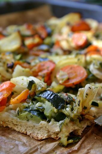 Keywords: vegetable pizza pizza eat food pizza topping vegetarian healthy vegetables baking tray zucchini carrot onion italian vegan delicious colorful vitamins rich in vitamins