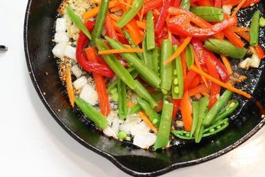 Keywords: vegetables food cooking meal healthy kitchen fresh dinner vegetarian cook pepper green red snap peas skillet pan hot ingredient organic