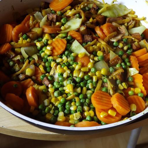 Keywords: vegetables pan food delicious eat peas meal carrots fry up asia tasty lunch substantial