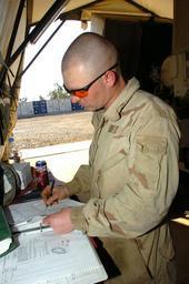 | Keywords: Vehicle Maintenance Keeps Apaches Airborne DVIDS37755.jpg en Although being arms deep in a truck engine is a large part of what a light-wheeled vehicle mechanic does day to day they also have to refer to many check lists and manuals to ensure the vehicle is maintained properly and nothing is missed Jonesboro Ark native Spc Christopher Cole a light-wheeled vehicle mechanic for Company E 4th Battalion 227th Aviation Regiment 1st Air Cavalry Brigade 1st Cavalry Division consults one of those manuals during an inspection at the 4-227th's motor pool at Camp Taji Iraq 2007-03-12 Staff Sgt Nathan Hoskins https //www dvidshub net/image/37755 37755 2007-03-12 15 00 TAJI IQ PD-USGov 1st Cavalry Division United States Camp Taji Images from DoD uploaded by Fæ |