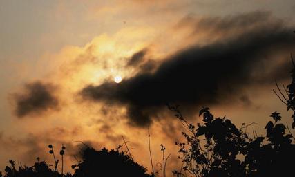 Keywords: veiled sun dark cloud sun orb sunlight light yellow-orange glow eerie mysterious foliage
