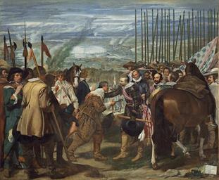 | Keywords: Velázquez - de Breda o Las Lanzas (Museo del Prado, 1634-35).jpg Artwork Creator Diego Velázquez The Surrender of Breda or žThe Lances Las lanzas o La rendición de Breda De overgave van Breda Die à bergabe von Breda 1635 oil on canvas cm 307 367 institution Prado 1 9A P01172 https //www museodelprado es/coleccion/galeria-on-line/galeria-on-line/obra/la-rendicion-de-breda-o-las-lanzas/ no_cache 1 Museo del Prado Madrid object history Colección Real Palacio del Buen Retiro Madrid 1701 nº 244; Palacio Real Nuevo antecámara de la serenÃsima infanta 1772 nº 244; Palacio Real Nuevo Madrid pieza de vestir 1794 nº 244; Palacio Real Madrid 1ª pieza de vestir 1814-1818 nº 244 credit line exhibition history source Other versions Q1133420 PD-old-100 Uploaded with UploadWizard La rendición de Breda Taken with Hasselblad H4D-50 |