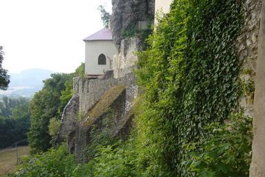 Keywords: Velka skalka zdivo.JPG en Ruin of abbey Velká Skalka supporting brickwork Skalka u Trenčína Slovakia cs Zříceniny opatství Skalka u Trenčína opěrné zdivo own Kenad 2010-07-16 Benedictine abbeys in Slovakia Skalka nad Váhom