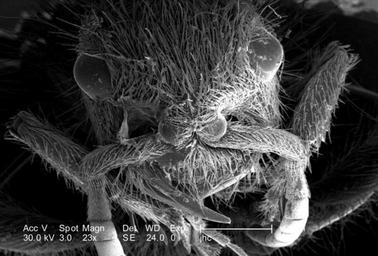 | Keywords: Velvet ant head anterior -- SEM photo.jpg en At a low magnification of only 23X this scanning electron micrograph SEM showed the head region from an anterior view of a female velvet ant Dasymutilla sp Note the two laterally positioned eyes the anterior pair of antennae each attached to the head by a rounded scape the numerous hairs or setae adorning almost all exterior surfaces and the jointed legs from which the insects Phylum Arthropoda is derived i e Arthro jointed and poda leg CDC PHIL ID 9897 Carr Janice PD-USGov Vespoidea heads Unidentified Mutillidae |