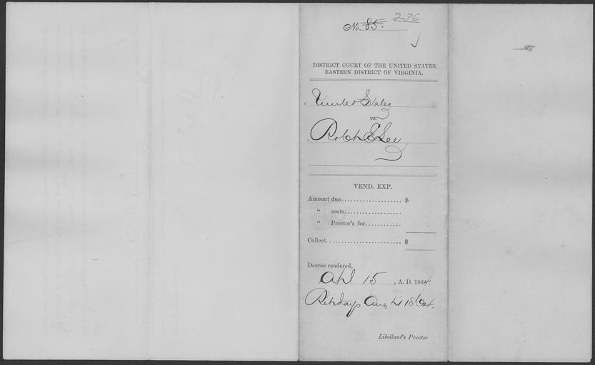 | Keywords: Venditioni Exponas filed in U.S. v. All the Rights, Titles, of Robert E. Lee (Robert E. Lee Confiscation Case) - NARA - 279095.jpg Scope and content This venditioni exponas Latin for expose to sale commands the U S Marshal to give ten days notice of the sale of personal property and twenty days notice of the sale of real estate in the case of U S v All the Rights Titles of Robert E Lee It further orders the Marshal to sell the personal property only and have the money from the sale in the Court at Alexandria on August 1 1864 General notes This document was filed by William H Barry Clerk The Robert E Lee Confiscation Case was originally docketed as Case 85 Prior to transfer to the National Archives the cases were rearranged alphabetically and the Robert E Lee Case renumbered as Case 236 Researchers may see annotations for both numbers on various documents but the original case is retrieved using Case 236 279095 Local identifier U S District Court for the Eastern District of Virginia Alexandria Term 06/11/1864 - ca 1866 NARA's Mid Atlantic Region Philadelphia NRBA 900 Market Street Philadelphia PA 19107-4292 date 1864 06 24 - 1864 06 24 Record group Record Group 21 Records of District Courts of the United States 1685 - 2004 Record group ARC 350 Confiscation Case Files compiled 1863 - 1865 Series ARC 279086 File unit U S v The Right Title Interest and Estate of Robert E Lee 08/29/1863 - 06/24/1864 File unit ARC 279087 Variant control numbers NAIL Control Number NRBPA-21-51E147-236-8 Other versions <gallery> File Venditioni_Exponas_filed_in_U S _v _All_the_Rights _Titles _of_Robert_E _Lee_ Robert_E _Lee_Confiscation_Case _-_NARA_-_279095 tif tif File Venditioni_Exponas_filed_in_U S _v _All_the_Rights _Titles _of_Robert_E _Lee_ Robert_E _Lee_Confiscation_Case _-_NARA_-_279095 jpg jpg </gallery> NARA-cooperation PD-USGov Manuscripts Legal documents Robert Edward Lee 1864 documents 24 June |