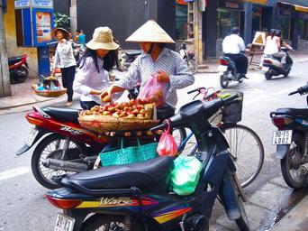 Keywords: vendor fruits women woman ladies hat vietnamese old street view motor people hanoi vietnam travel road lifestyle outdoor town city street car road vehicle transportation busy