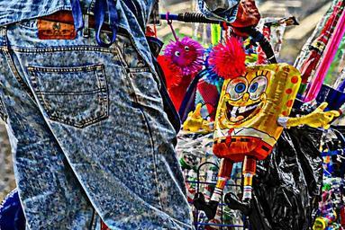 Keywords: vendor sponge bob toys jeans man childhood cart seller joy happy parade consumer retail business