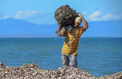Keywords: venezuela sea ocean water sky clouds man working bag carrying beach shells mussels scenic nature outside mountains tropics tropical