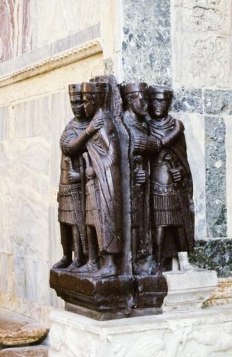 | Keywords: Venice Four Emperors 04557.JPG I tetrarchi dal greco quattro regnanti furono i quattro co-regnanti che governarono l'impero romano durante la riforma di Diocleziano Qui sono ritratti mentre si abbracciano in segno di concordia e armonia in una scultura in porfido del IV secolo d C di provenienza orientale oggi a Venezia sull'angolo di San Marco accanto alla Porta della Carta The tetrarchs from the Greek words for Four rules were the four co-rulers that governed the Roman Empire as long as Diocletian's reform lasted Here they were portraied embracing in sign of harmony in a porphyry sculpture dating from the 4th century produced in Asia Minor today on a corner of Saint Mark's in Venice next to the Porta della Carta Venedig “ Die vier Tetrarchen uploaded from Wikipedia 2005 Photo by G Larson w User Glenlarson Glenlarson Statues of the Tetrarchs Venice Corner Statues of four people |