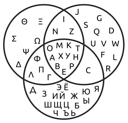 | Keywords: Venn diagram gr la ru.svg Venn diagram of Greek Latin and Russian Cyrillic upper case graphemes The intersections with the Latin alphabet are used for Greek and Russian licence plates <br> Licence plates in Greece use the letters Α Β Ε Ζ Η Ι Κ Ο Ρ Τ Υ Χ <br> Licence plates in Russia use the letters А В Е К О Р С Т У Х Inclusive versus exclusive <table style width 100 ; > <tr> <td>thumb center 400px This file is as inclusive as possible </td> <td>thumb center 400px This other file is as exclusive as possible <br>It even shows w Upsilon Greek Υ seperately as <math>\Upsilon</math> </td> </tr> </table> thumb Cyrillic У and Greek or Latin Y can both be represented by the grapheme in the middle which is used in this diagram thumb The typical forms of Л and Д on the left and the ones used in this diagram on the right thumb У on Russian licence plates thumb Cyrillic Л like Greek Λ Y / У They are different in most printed text but can be represented in the same way In handwritten blockletters they usually look the same <br> Cyrillic У is in the Russian licence plates because in countries that do not use the Cyrillic alphabet it will be read as Y <br> Cyrillic У always has two strokes and often a rounded bottom end Y is usually symmetric when printed <br> In the typeface Ubuntu used for this diagram they actually look different The intermediate form used is created by hand <small> Asymmetric Latin Y serif sans sans comic graffiti<br> Asymmetric Greek Y graffiti graffiti<br> Cyrillic У without rounded end sans sans licence plates </small> Λ / Л Cyrillic Л looks like Greek Λ in some typefaces - e g in the incription on Lenin's Mausoleum <br> In handwritten blockletters this form is common or even prevailing <br> In the typeface Ubuntu used for this diagram they actually look different <small> Graffiti <br> Other </small> K / К They are slightly different in many typefaces The Cyrillic К often has a rounded upper arm and usually looks like half a Ж <br> <small>Typical Cyrillic К in Семилуки city-limit sign</small> thumb left 500px This Russian graffiti uses the same letter shapes as the diagram own 2011 Watchduck <gallery> File Venn diagram showing Greek Latin and Cyrillic letters svg exclusive File Venn diagram gr la sr svg Serbian Cyrillic </gallery> Other fields I + < a < 3-set Venn diagrams Greek alphabet Latin alphabet Cyrillic alphabet Intersection set theory Ubuntu Font Family |