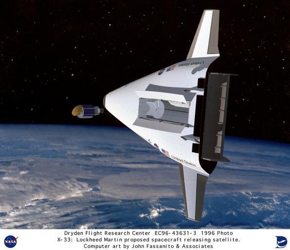 | Keywords: VentureStar by Lockheed Martin Releasing Satellite - Computer Graphic DVIDS735783.jpg en This is an artist's conception of the NASA/Lockheed Martin Single-Stage-To-Orbit SSTO Reusable Launch Vehicle RLV releasing a satellite into orbit around the Earth NASA's Dryden Flight Research Center Edwards California expected to play a key role in the development and flight testing of the X-33 which was a technology demonstrator vehicle for a possible RLV The RLV technology program was a cooperative agreement between NASA and industry The goal of the RLV technology program was to enable significant reductions in the cost of access to space and to promote the creation and delivery of new space services and other activities that would improve U S economic competitiveness The X-33 was a wedged-shaped subscale technology demonstrator prototype of a potential future Reusable Launch Vehicle RLV that Lockheed Martin had dubbed VentureStar The company had hoped to develop VentureStar early this century Through demonstration flight and ground research NASA's X-33 program was to have provided the information needed for industry representatives such as Lockheed Martin to decide whether to proceed with the development of a full-scale commercial RLV program A full-scale single-stage-to-orbit RLV was to have dramatically increased reliability and lowered the costs of putting a pound of payload into space from the current figure of 10 000 to 1 000 Reducing the cost associated with transporting payloads in Low Earth Orbit LEO by using a commercial RLV was to have created new opportunities for space access and significantly improved U S economic competitiveness in the world-wide launch marketplace NASA expected to be a customer not the operator of the commercial RLV The X-33 design was based on a lifting body shape with two revolutionary linear aerospike rocket engines and a rugged metallic thermal protection system The vehicle also had lightweight components and fuel tanks built to conform to the vehicle's outer shape Time between X-33 flights was normally to have been seven days but the program hoped to demonstrate a two-day turnaround between flights during the flight-test phase of the program The X-33 was to have been an unpiloted vehicle that took off vertically like a rocket and landed horizontally like an airplane It was to have reached altitudes of up to 50 miles and high hypersonic speeds The X-33 program was managed by the Marshall Space Flight Center and was to have been launched at a special launch site on Edwards Air Force Base Due to technical problems with the liquid hydrogen fuel tank and the resulting increase in cost and schedule delay the X-33 program was cancelled in February 2001 NASA Identifier NIX-EC96-43631-3 2009-09-23 Glenn Research Center https //www dvidshub net/image/735783 735783 2012-10-17 21 41 WASHINGTON DC US PD-USGov Edwards Air Force Base Images from DoD uploaded by Fæ VentureStar |