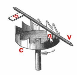 | Keywords: Verge Escapement Labelled.png Drawing of verge escapement used in antique clocks and watches Invented in the 13th century it was the mechanism used in all clocks and watches for 400 years until about 1660 The labeled parts are c crown wheel v verge p q pallets An error in the drawing is that the crown wheel is shown with 12 teeth; verge escapements must actually have an odd number of teeth to function Alterations Removed pendulum crutch Erased upper pallet which was drawn incorrectly parallel to the other pallet and redrew pallet in correct position Removed caption and part labels replaced labels with new colored ones Downloaded from http //books google com/books id 0G8DAAAAQAAJ pg PA153 Henry Evers 1874 A Handbook of Applied Mechanics William Collins Sons London fig 58 p 153 on Google Books published 1874 Henry Evers Public domain - author died more than 70 years ago Image Verge_Escapement png PD-old Verge Escapement Old horology prints |