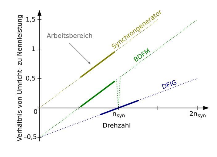 Keywords: Vergleich BDFM.svg Kaskadenmaschine Der Synchrongenerator benötigt die größte Umrichter Leistung im Verhältnis zur Nennleistung und der doppelt gespeiste Asynchrongenerator DFIG am wenigsten mit dem Nachteil des Bürstenverschleißes Die Kaskadenmaschine BDFM bildet hier den Mittelweg own Biezl Inkscape SVG electric motors