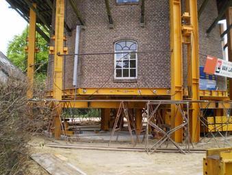 Keywords: Verhoging Daams' molen (6).jpg Daams' molen in het centrum Vaassen is terug op zijn plaats na tijdelijk 28 meter te zijn verplaatst om met een nieuw fundament bijna 5 meter hoger te komen staan en zo meer wind te kunnen vangen Na de terugplaatsing werd het bouwwerk opgevijzeld own 2012-05-12 Apdency Daams' molen lifting project Cc-zero