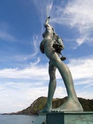| Keywords: verity stainless steel stainlesssteel bronze statue bronzestatue damien hirst damienhirst sculpture pier harbour ilfracombe devon bristol channel truth modern allegory truth and justice truthandjustice pregnant woman pregnant woman pregnantwoman fetus scales of justice scalesofjustice little dancer littledancer edgar degas edgardegas virgin mother virginmother pangolin polymer-strengthened fibre glass polymerstrengthenedfibreglass fibre glass fibreglass angel of the north angelofthenorth controversial critical ugly outdoor statue sport jump Verity is a stainless steel and bronze statue created by Damien Hirst. The 20.25-metre (66.4 ft) tall sculpture stands on the pier at the entrance to the harbour in Ilfracombe, Devon, looking out over the Bristol Channel towards South Wales. It has been loaned to the town for 20 years. The name of the piece refers to "truth" and Hirst describes his work as a "modern allegory of truth and justice". The statue depicts a pregnant woman holding aloft a sword while carrying the scales of justice and standing on a pile of law books. Half of the sculpture shows the internal anatomy of the pregnant woman, with the fetus clearly visible. The stance has been described as a reference to Little Dancer of Fourteen Years by Edgar Degas, a work that previously inspired Hirst when he created Virgin Mother. The sculpture was cast in stainless steel and bronze in 40 separate sections by Pangolin Editions. The sword, which gives the statue much of its height, and the upper left arm is one polymer-strengthened fibre glass piece. Before being cleared for erection the statue was subjected to tests in a wind tunnel to ensure that it could cope with high winds and spray from the sea. Measuring 25cm (10 inches) higher than the Angel of the North, Verity became the tallest statue in the UK when it was put into place. Members of North Devon Council referred to the controversial nature of the statue as a potential boost to tourism. Local reaction was very mixed, with those critical of the work calling it "ugly" and stating that "it isn't suitable for a Victorian seaside town". Before they allowed planning permission the council received 100 letters from people who objected to the installation of the statue, and 177 letters supporting the application. In August 2013 councillors announced that the statue had a "tremendous effect" with people visiting the town solely to see Hirst's work. Hirst, who lives in Ilfracombe, has loaned the statue to the town for 20 years starting from its erection on 16 October 2012. Verity is a stainless steel and bronze statue created by Damien Hirst. The 20.25-metre (66.4 ft) tall sculpture stands on the pier at the entrance to the harbour in Ilfracombe, Devon, looking out over the Bristol Channel towards South Wales. It has been loaned to the town for 20 years. The name of the piece refers to "truth" and Hirst describes his work as a "modern allegory of truth and justice". The statue depicts a pregnant woman holding aloft a sword while carrying the scales of justice and standing on a pile of law books. Half of the sculpture shows the internal anatomy of the pregnant woman, with the fetus clearly visible. The stance has been described as a reference to Little Dancer of Fourteen Years by Edgar Degas, a work that previously inspired Hirst when he created Virgin Mother. The sculpture was cast in stainless steel and bronze in 40 separate sections by Pangolin Editions. The sword, which gives the statue much of its height, and the upper left arm is one polymer-strengthened fibre glass piece. Before being cleared for erection the statue was subjected to tests in a wind tunnel to ensure that it could cope with high winds and spray from the sea. Measuring 25cm (10 inches) higher than the Angel of the North, Verity became the tallest statue in the UK when it was put into place. Members of North Devon Council referred to the controversial nature of the statue as a potential boost to tourism. Local reaction was very mixed, with those critical of the work calling it "ugly" and stating that "it isn't suitable for a Victorian seaside town". Before they allowed planning permission the council received 100 letters from people who objected to the installation of the statue, and 177 letters supporting the application. In August 2013 councillors announced that the statue had a "tremendous effect" with people visiting the town solely to see Hirst's work. Hirst, who lives in Ilfracombe, has loaned the statue to the town for 20 years starting from its erection on 16 October 2012. |